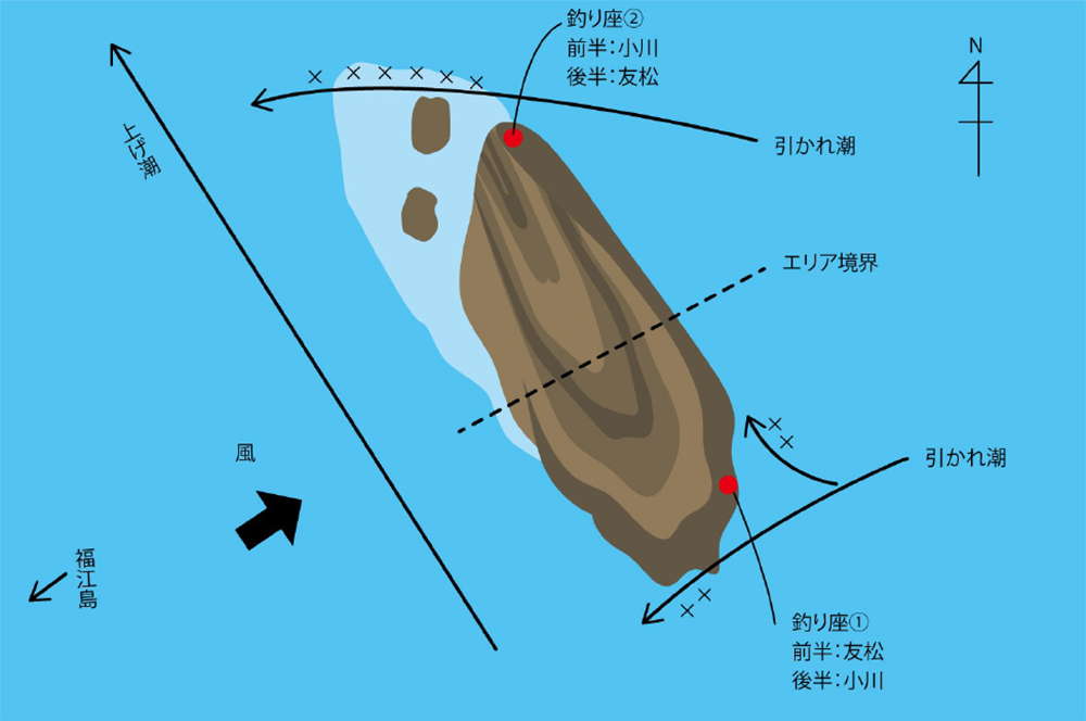 しかしこの日は福江島との水道にあたる釣り座の後方を潮が抜けてしまい、それに引かれた潮が釣り座に当ててくるという好ましくない状況。しかも磯の裏はハエ根が張り出しているうえに、南寄りの風が強く吹き付けていて竿を出すのは困難です。目の前の当て潮をいかに攻略するか。これが勝敗の分かれ目になることは、誰の目に見ても明らかでした。