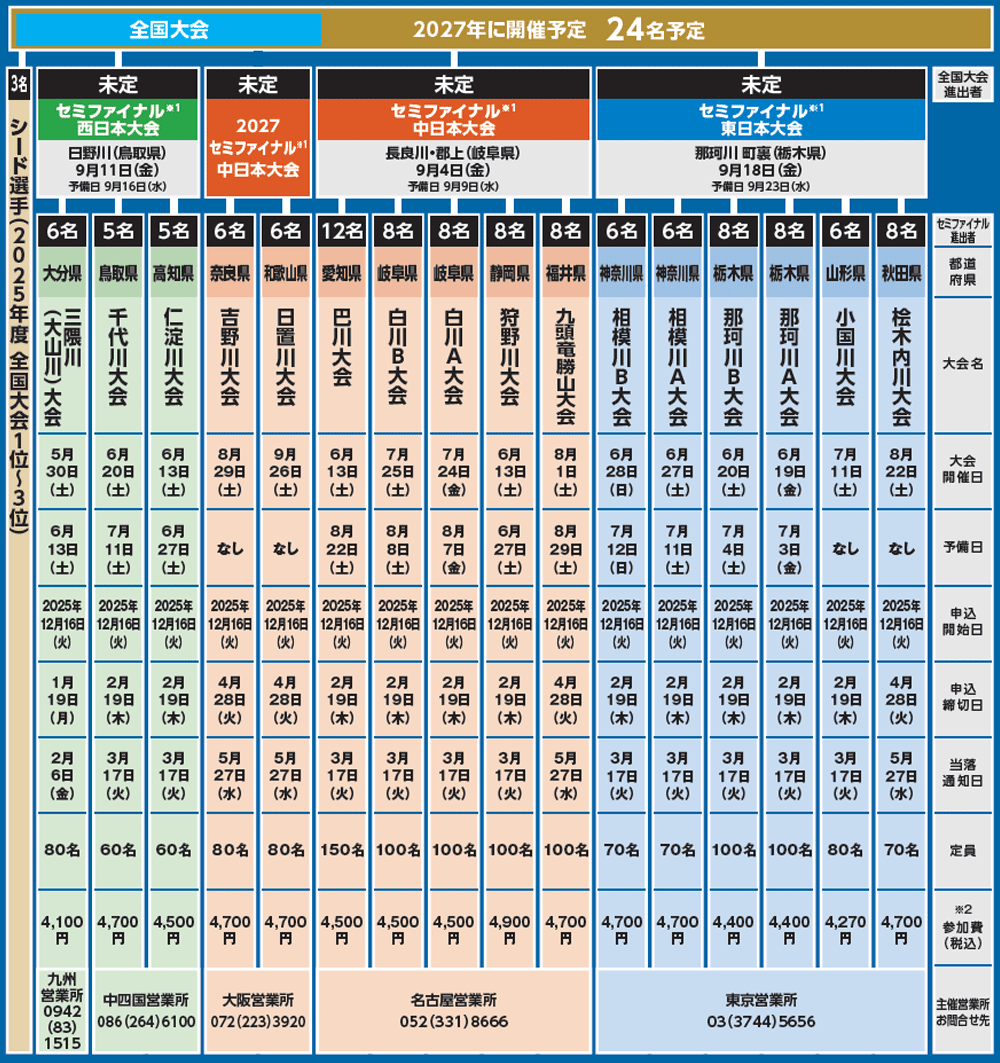 - ☆地区大会からセミファイナル大会、セミファイナル大会から全国大会への進出者数は、各大会当日の実参加者数、大会中止やシード選手(昨年度全国大会4位以降)の参加者数等により変更される場合があります。