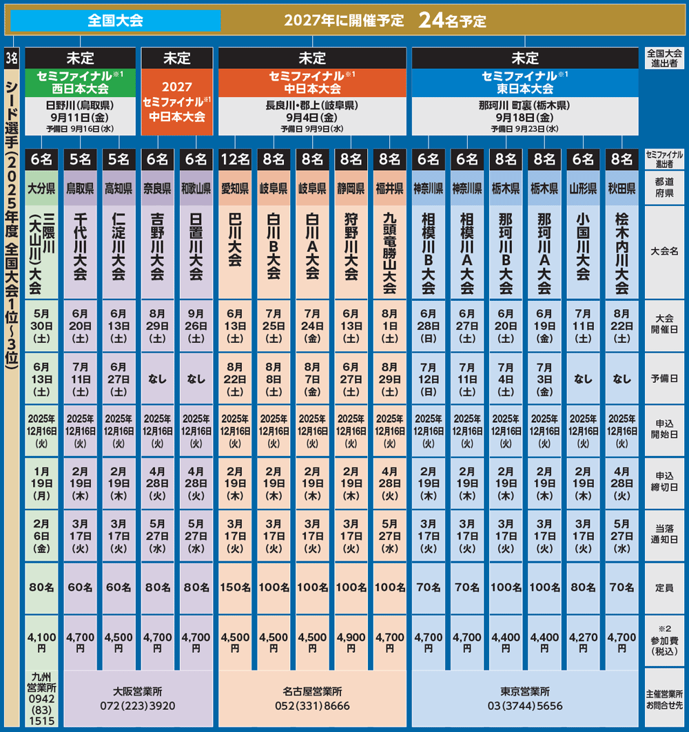 - ☆地区大会からセミファイナル大会、セミファイナル大会から全国大会への進出者数は、各大会当日の実参加者数、大会中止やシード選手(昨年度全国大会4位以降)の参加者数等により変更される場合があります。
