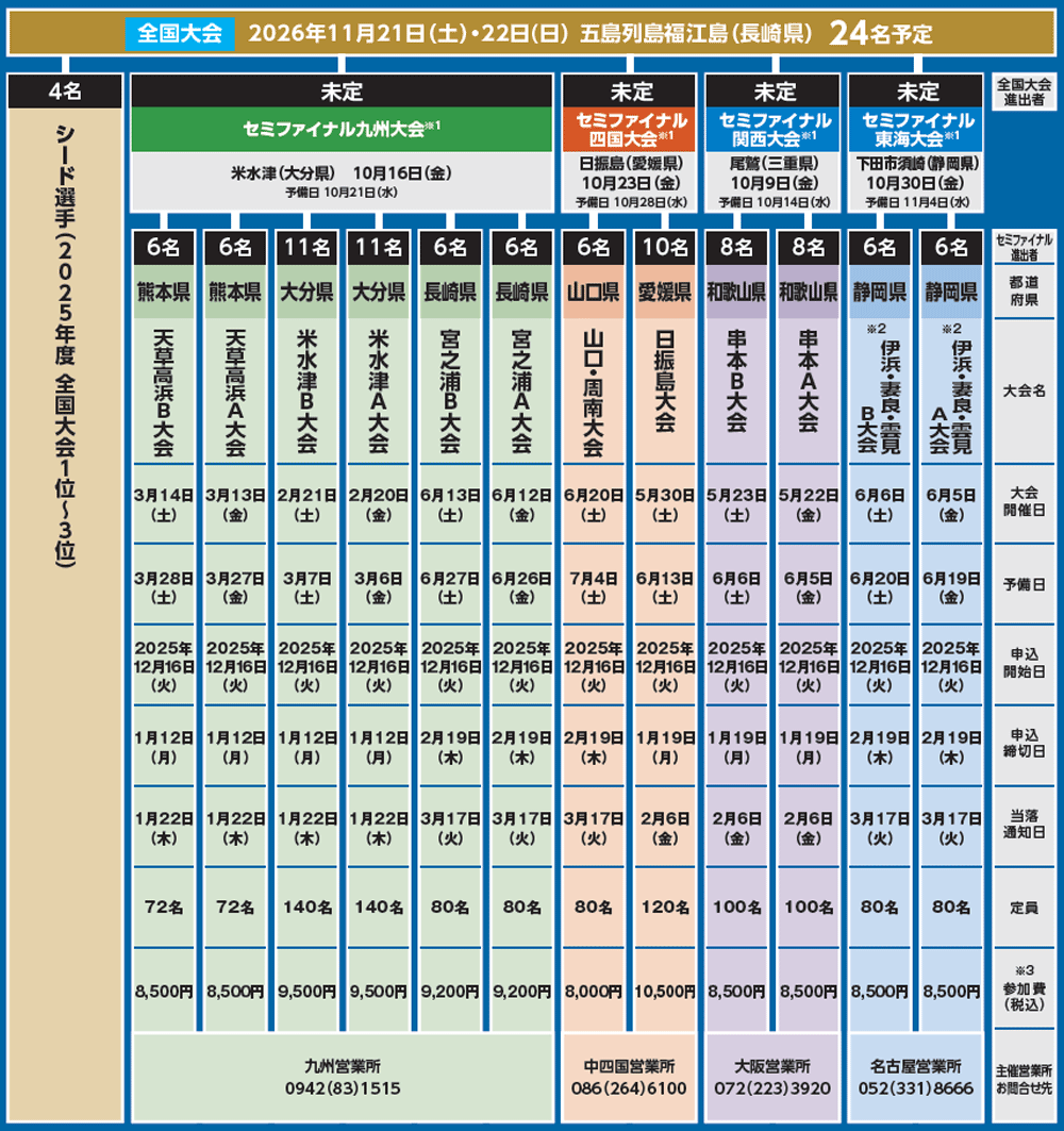 - ☆地区大会からセミファイナル大会、セミファイナル大会から全国大会への進出者数は、各大会当日の実参加者数、大会中止やシード選手(昨年度全国大会5位以降)の参加者数等により変更される場合があります。
