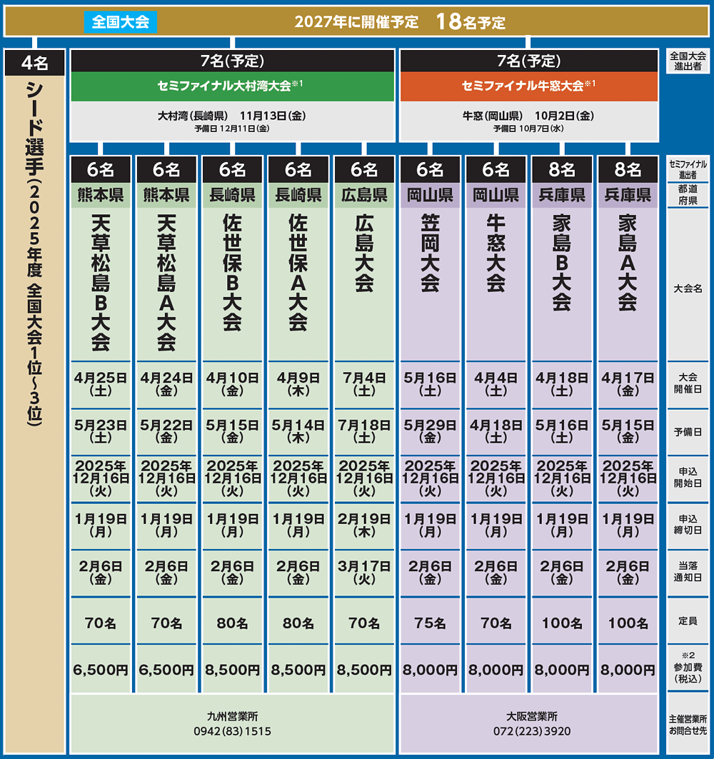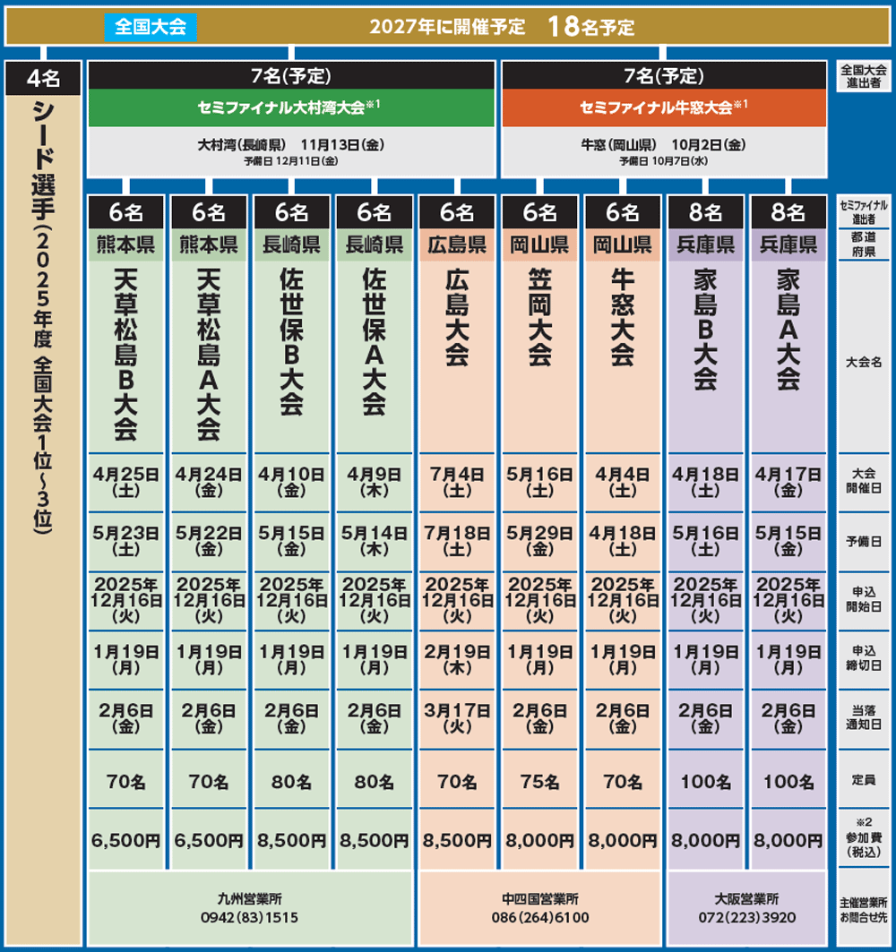 - ☆地区大会からセミファイナル大会、セミファイナル大会から全国大会への進出者数は、各大会当日の実参加者数、大会中止やシード選手(昨年度全国大会1位~3位)の参加者数等により変更される場合があります。