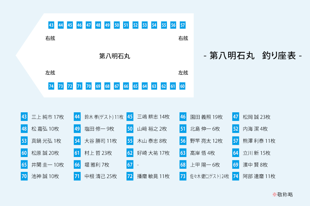 大会結果は、優勝が第八明石丸ご乗船の中根 清己様で25匹。準優勝は第七明石丸ご乗船の稲見 清士様で24匹。第三位は第七明石丸ご乗船の久松 秀文様で24匹となりました。